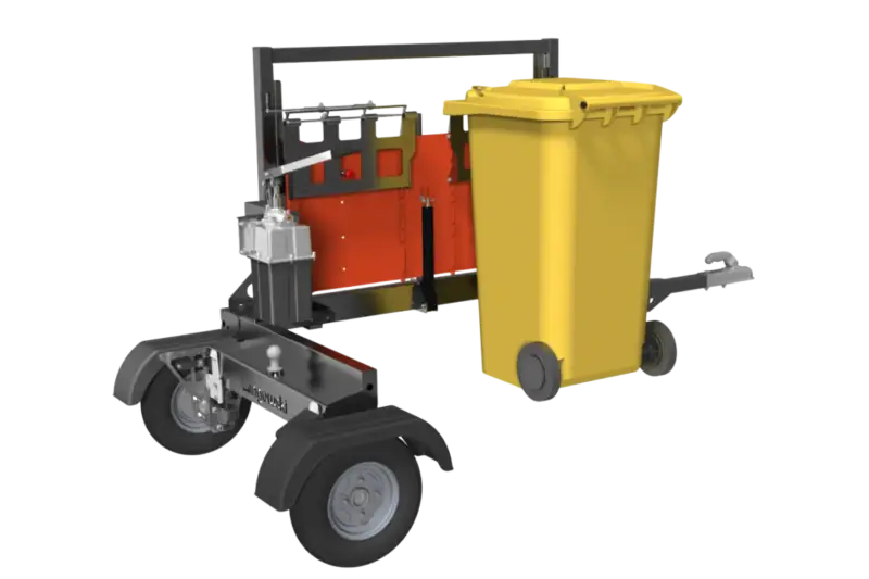 The top-of-the-range BIN BEAST model enables the safe transport of all waste container sizes from 120 litres to 1,100 litres (in accordance with DIN EN 840). Thanks to road approval, it is also possible to drive to the nearest recycling centre. The containers are picked up via a comb pick-up and secured with a hold-down device. The containers are raised and lowered using a hand hydraulic pump or optionally using an electro-hydraulic pump with remote control, which offers additional convenience for the operator.